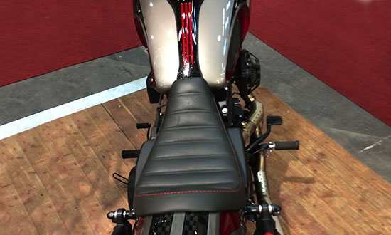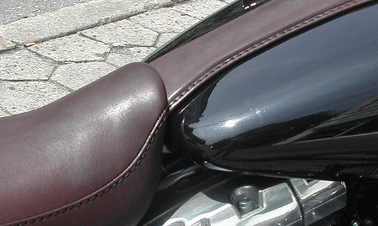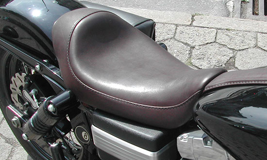 Neuanfertigung · Bei Tank- oder Heckumbau passt meistens die originale Sitzbank nicht mehr. Es muss eine neue Karkasse am Motorrad angepasst werden, sodass alle Konturen des Motorrades stimmig aufgenommen werden. In der Regel wird dazu das Bike in der Werkstatt vor Ort benötigt. Auf die angefertigte Karkasse wird ein Polster aus Schaumstoff oder Federkern (Mindestbauhöhe für Federkern ist 5 cm) aufgebracht und der ausgesuchte Bezug aus Kunstleder oder echtem Leder angepasst.