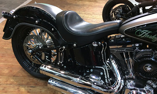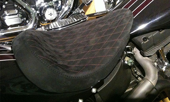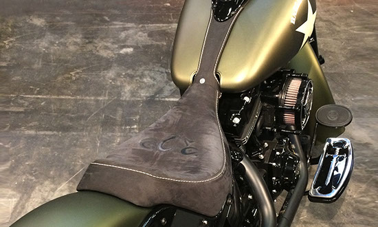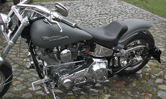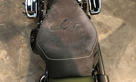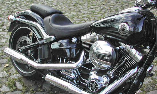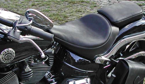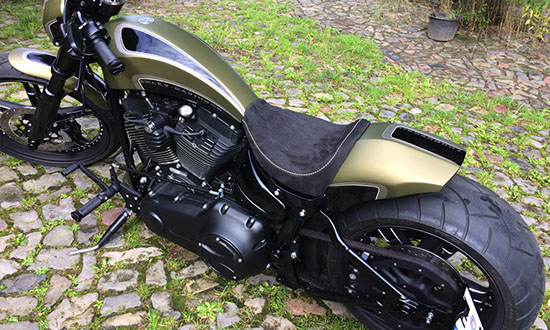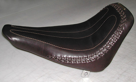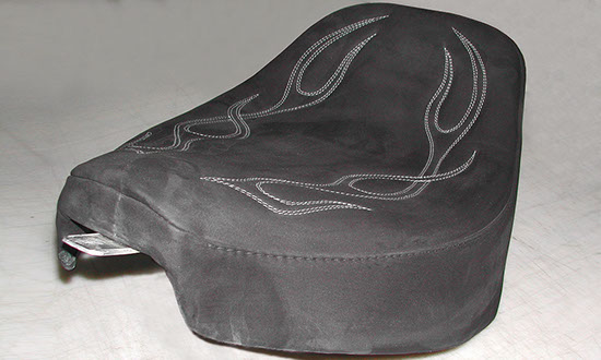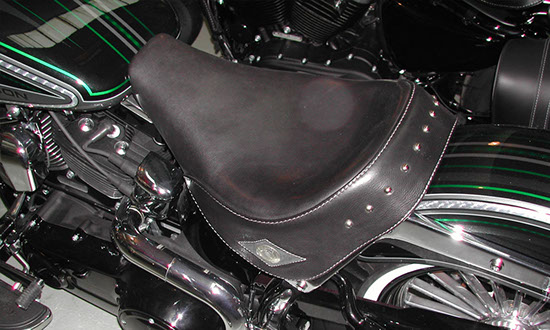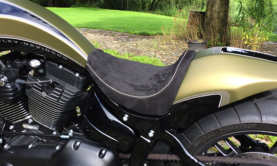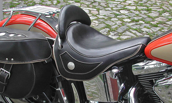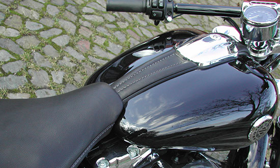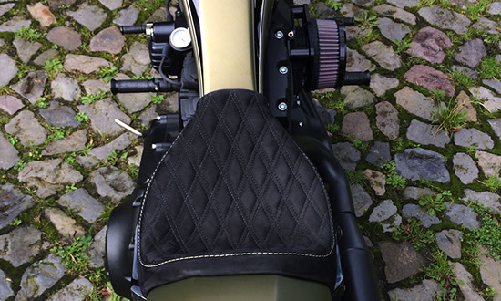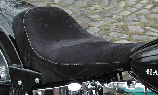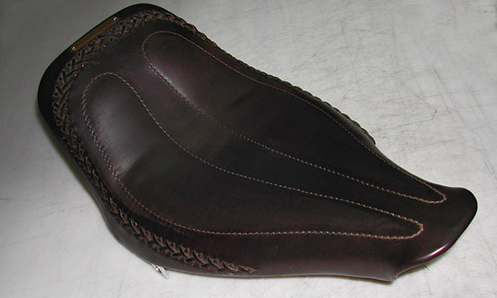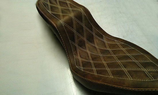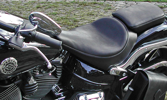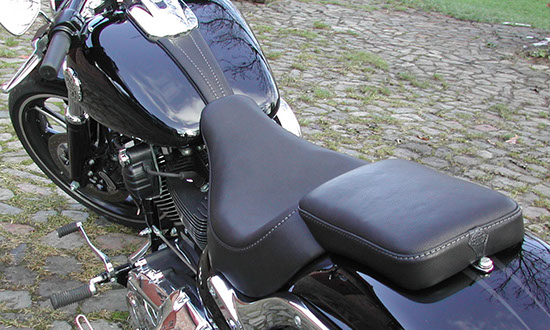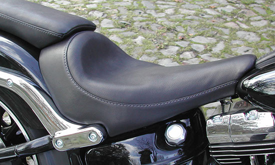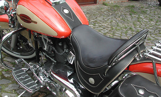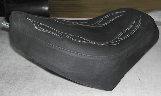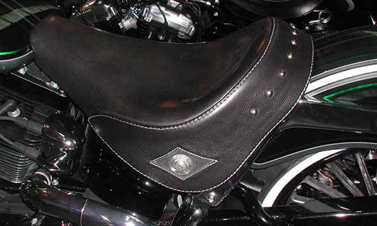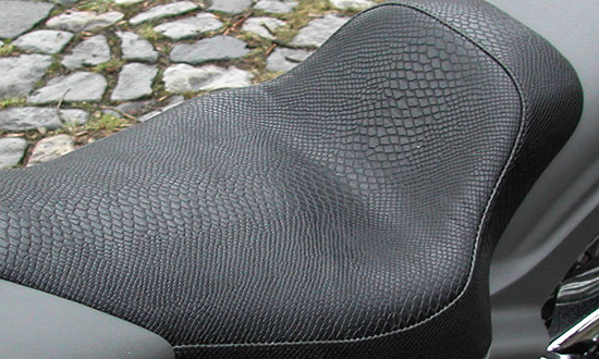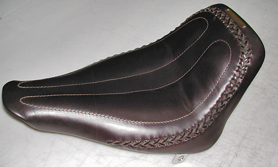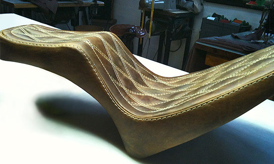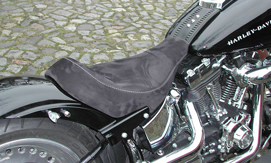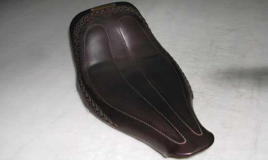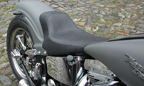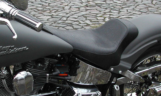Neuanfertigung · Bei Tank- oder Heckumbau passt meistens die originale Sitzbank nicht mehr. Es muss eine neue Karkasse am Motorrad angepasst werden, sodass alle Konturen des Motorrades stimmig aufgenommen werden. In der Regel wird dazu das Bike in der Werkstatt vor Ort benötigt. Auf die angefertigte Karkasse wird ein Polster aus Schaumstoff oder Federkern (Mindestbauhöhe für Federkern ist 5 cm) aufgebracht und der ausgesuchte Bezug aus Kunstleder oder echtem Leder angepasst.
